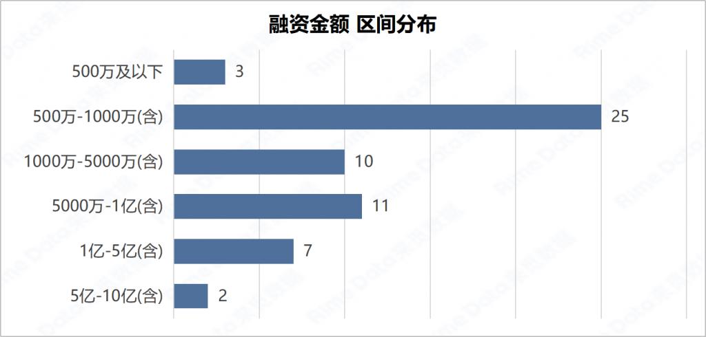 本周已披露金额的融资事件 58 起,较上周增加 3 起,融资金额区间分布结构与上周变化不大,本周 500 万以下的融资事件 3 起,与上周持平;500 万 -1000 万(含 1000 万)融资事件合计 25 起,较上周减少 3 起;1000 万 -5000 万(含 5000 万)融资事件为 10 起,较上周增加 4 起;5000 万 -1 亿(含 1 亿)的融资事件 11 起,较上周增加 3 起;1-5 亿(含 5 亿)融资事件为 7 起,与上周持平;5-10 亿(含 10 亿)融资事件为 2 起,与上周相同;本周无 10 亿以上融资事件,而上周有 1 起。