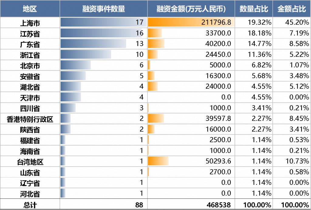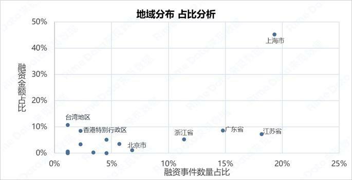 本周地域分布上,融资事件数量前五的地区是上海市、江苏省、广东省、浙江省和北京市,前五地区合计发生融资事件 62 起,占所有融资事件数量总和的 70.45%,地域集中度较上周有所下降。融资金额方面,前五的地区为上海市、台湾地区、广东省、香港特别行政区、江苏省,前五地区融资金额合计 37.56 亿元,占所有融资总额的 80.16%,融资金额上地域集中度较上周有所上升。上海市融资金额排名第一主要是由于其融资事件较多,且有 5 起亿元及以上融资事件。