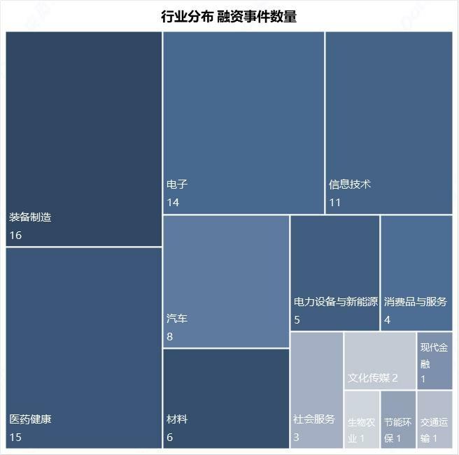 本周融资事件共涉及到 14 个行业,按融资事件数量统计,前五行业依次为装备制造、医药健康、电子、信息技术和汽车,前五行业的融资事件合计 64 起,占所有融资事件数量总和的 72.73%,行业集中度较上周有所下降。从融资事件数量来看,本周装备制造融资数量排名第一,为 16 起,其中机器人细分领域有 5 起。医药健康排名第二,为 15 起,集中在医疗器械领域。电子排名第三,为 14 起,半导体设备细分领域有 6 起。