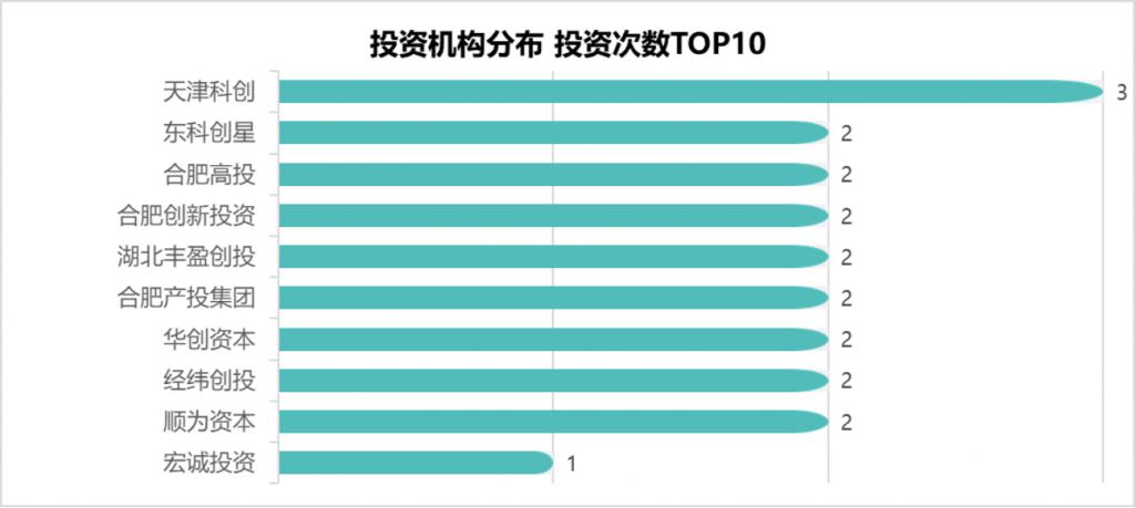 从机构投资活跃度来看,本周共有 107 家投资机构参与投资,合计出手 117 次。其中,天津科创(3 次),东科创星、合肥高投、合肥创新投资、湖北丰盈创投、合肥产投集团、华创资本、经纬创投、顺为资本均为 2 次,在创投市场中较为活跃。