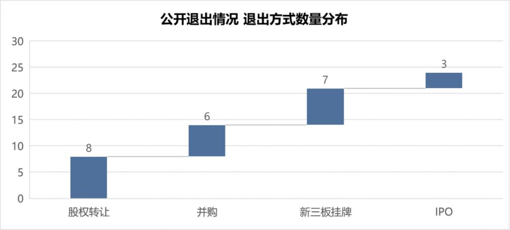 从退出情况来看,本周共有 24 个公开退出案例,比上周减少 4 个;其中,股权转让 8 个,较上周减少 6 个;并购 6 个,较上周增加 1 个;新三板挂牌 7 个,较上周增加 4 个;IPO 3 个,较上周减少 3 个。