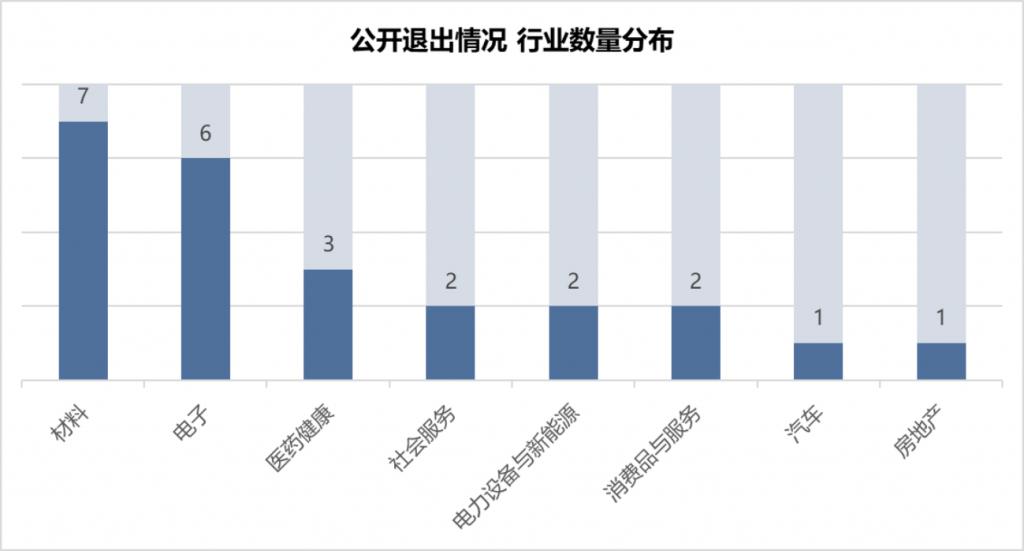 从行业分布来看,本周退出案例共涉及 8 个行业,较上周减少 2 个。退出案例数量最多的行业为材料,电子和医药健康分居二、三位,三大行业合计退出案例 16 个,占总案例数的 66.67%。