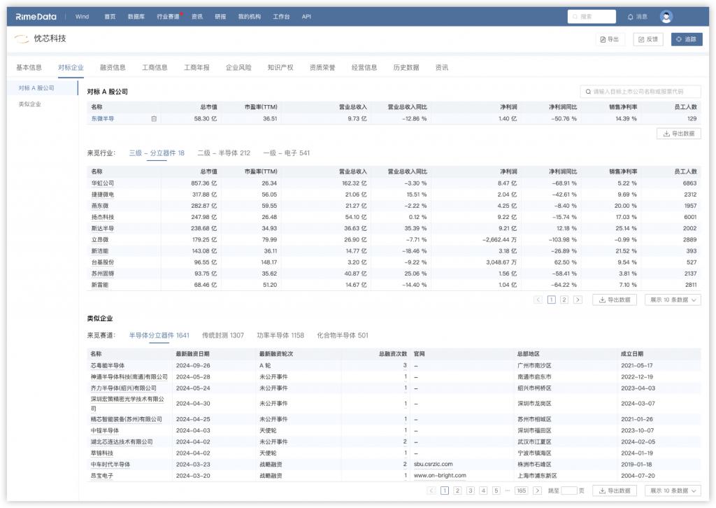 企业对标是指企业通过与同行业内的其他企业进行比较,找出自身的优势和不足,从而制定出更加科学、合理的经营策略和发展目标。来觅数据推出的对标企业功能,帮助用户对标 A 股上市公司。通过此功能,用户可以通过来觅行业将当前项目与 A 股上市公司进行比对,涵盖当前项目所在的各个层级行业上市公司对标列表,一览核心财务指标、总市值、市盈率等数据,辅助项目估值定价,了解同行业二级市场发展态势。此外,来觅数据还提供了自动添加对标企业功能,用户可在该板块手动输入目标 A 股上市公司股票代码或者名称进行查找,并将其添加在该模块下,方便用户自定义对标公司列表。
